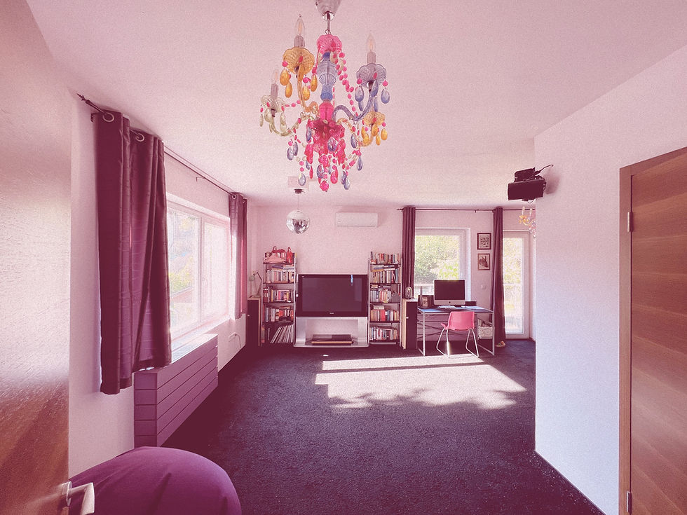 A study on the top floor that can easily be converted into a library, an additional bedroom or kids room. The en-suite bath with massage tub makes this ideal for guest quarters, while the plush carpeting and playful fixtures, from chandeliers to disco ball, encourage creative inspiration. The balcony overlooks the hills above the property, where you can marvel at the foliage changing with the seasons.